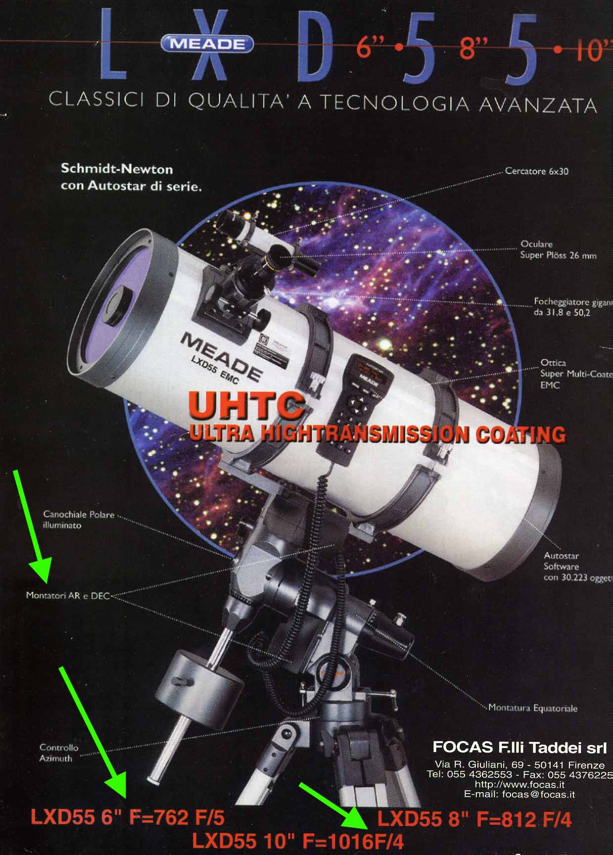 Settembre 2002 Pare proprio che la Meade non riesca a fare un depliant o una pubblicità senza incappare in qualche errore, così a me tocca aggiornare lo stupidario... Vediamo un po' questo. Nella pagina pubblicitaria dei nuovi LXD 55, dove troneggia il Newton-Schmidt, ci sono, a voler essere pignoli, tre errori; il primo salta proprio all' occhio: i motori di A.R. e Dec. sono segnati come "Montatori" anziché "Motori". Il secondo riguarda le scritte in rosso di fondo pagina che descrivono i telescopi: la lunghezza focale è espressa con la "F" maiuscola e così anche il rapporto focale, però quest'ultimo si scriverebbe con la "f" minuscola. Vero è che tutte tre le scritte sono a caratteri maiuscoli ma per me rimane una inesattezza. Infine proprio in queste scritte c' è un altro piccolissimo errore: le prime due hanno lo spazio tra lunghezza focale e rapporto focale, la terza, quella centrale, no. Lo so, questo è andare a cercare il pelo nell'uovo...